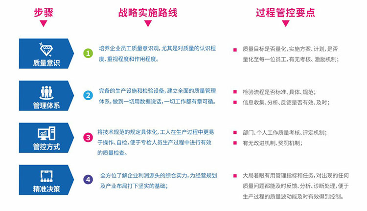 制程管理戰(zhàn)略涵蓋:來料檢驗分析、LQC生產(chǎn)檢驗缺陷采集、PQC功能測試缺陷采集、OQC出貨檢驗缺陷采集、抽檢加嚴、DPPM缺陷分析、SPC分析、制程品質能力評估等。